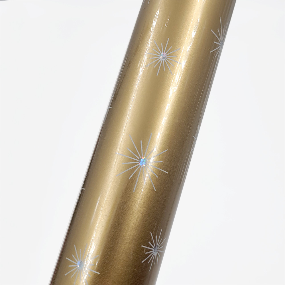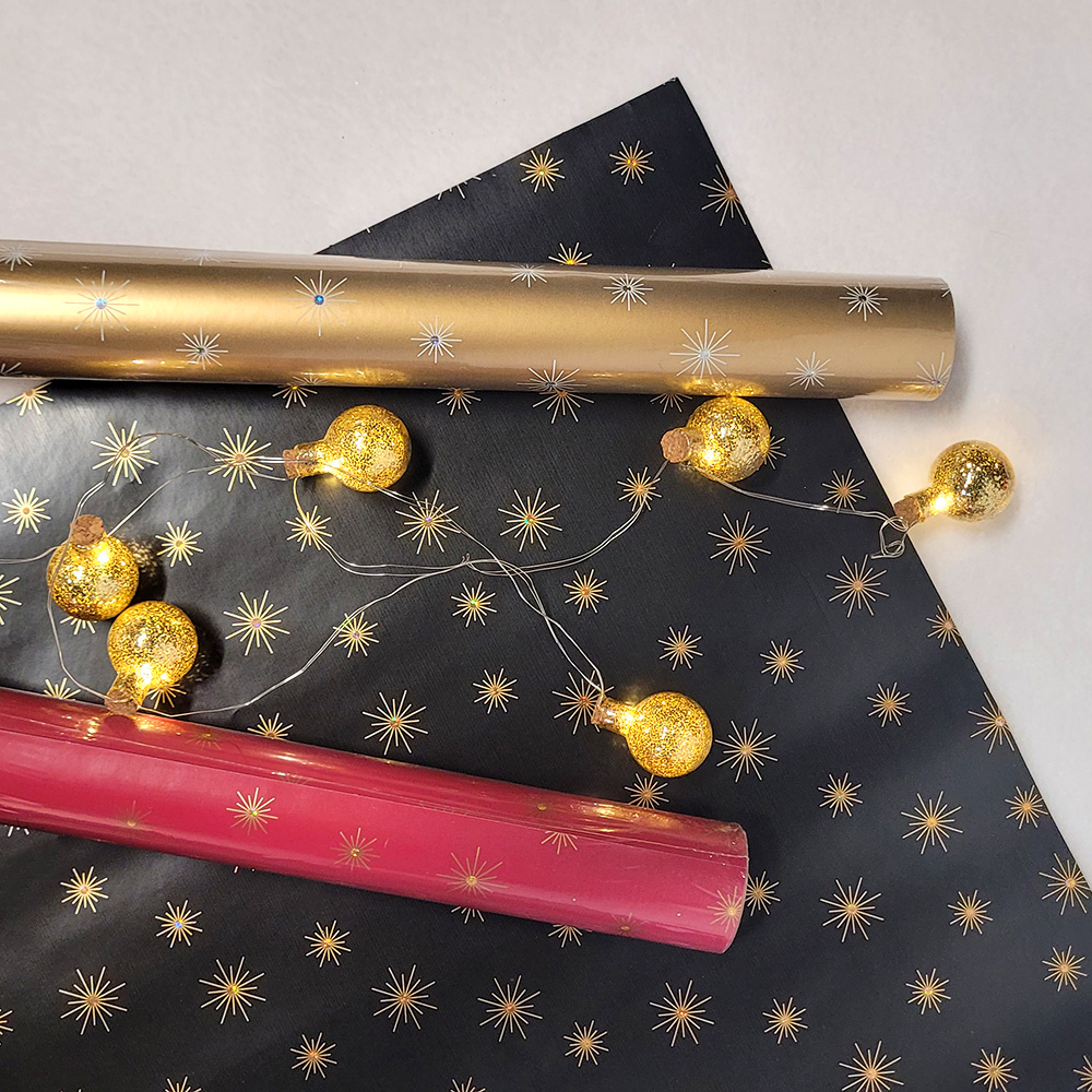 Упаковочная бумага с новогодним принтом и голографическими элементами, с обратной стороны белая.