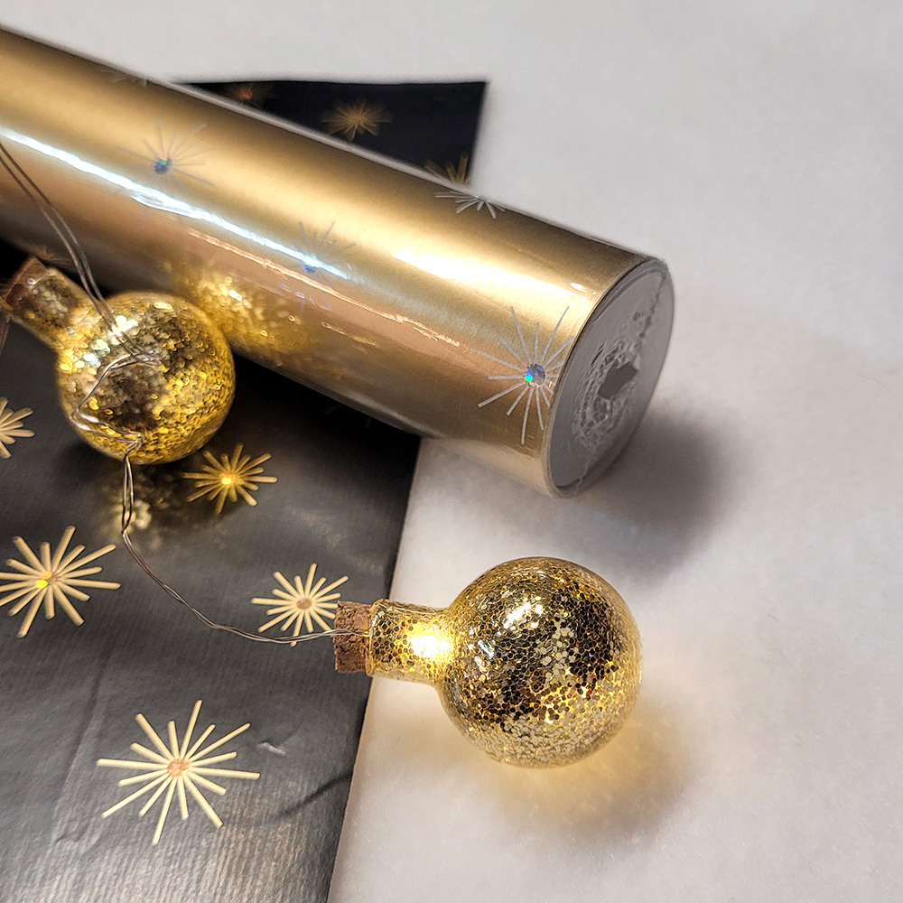 Упаковочная бумага с новогодним принтом и голографическими элементами, с обратной стороны белая.